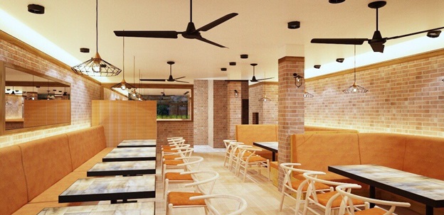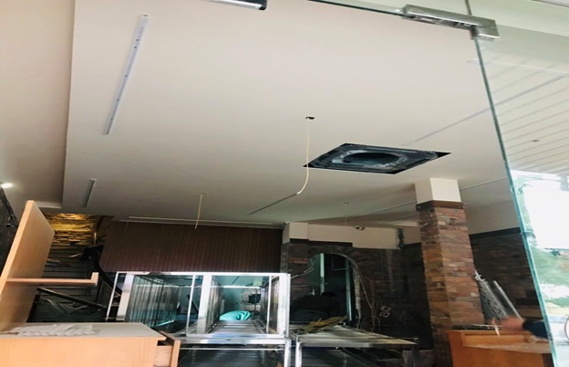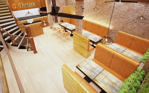 Không gian là yếu tố quan trọng tạo nên sức thu hút và thẩm mỹ của nhà hàng. Trần thạch cao là loại vật liệu xây dựng rất dễ tạo hình, có thể thiết kế đa dạng, và đặc biệt là che đi phần cứng nhắc của trần bê tông; đồng thời trần thạch cao nhà hàng có thể dễ dàng kết hợp cùng các loại đèn trang trí tạo nên một hiệu ứng ánh sáng tuyệt vời. Nhà hàng O Tomato tại 82 Lê Văn Hưu đã chọn mẫu thạch cao kết hợp hệ thống đèn được lắp đặt âm trong trần đã tạo ra nguồn sáng gián tiếp, ánh sáng không quá mạnh mà dịu nhẹ, lan tỏa tạo nên một không gian ẩm thực ấm áp, sang trọng vừa lòng mọi thực khách.